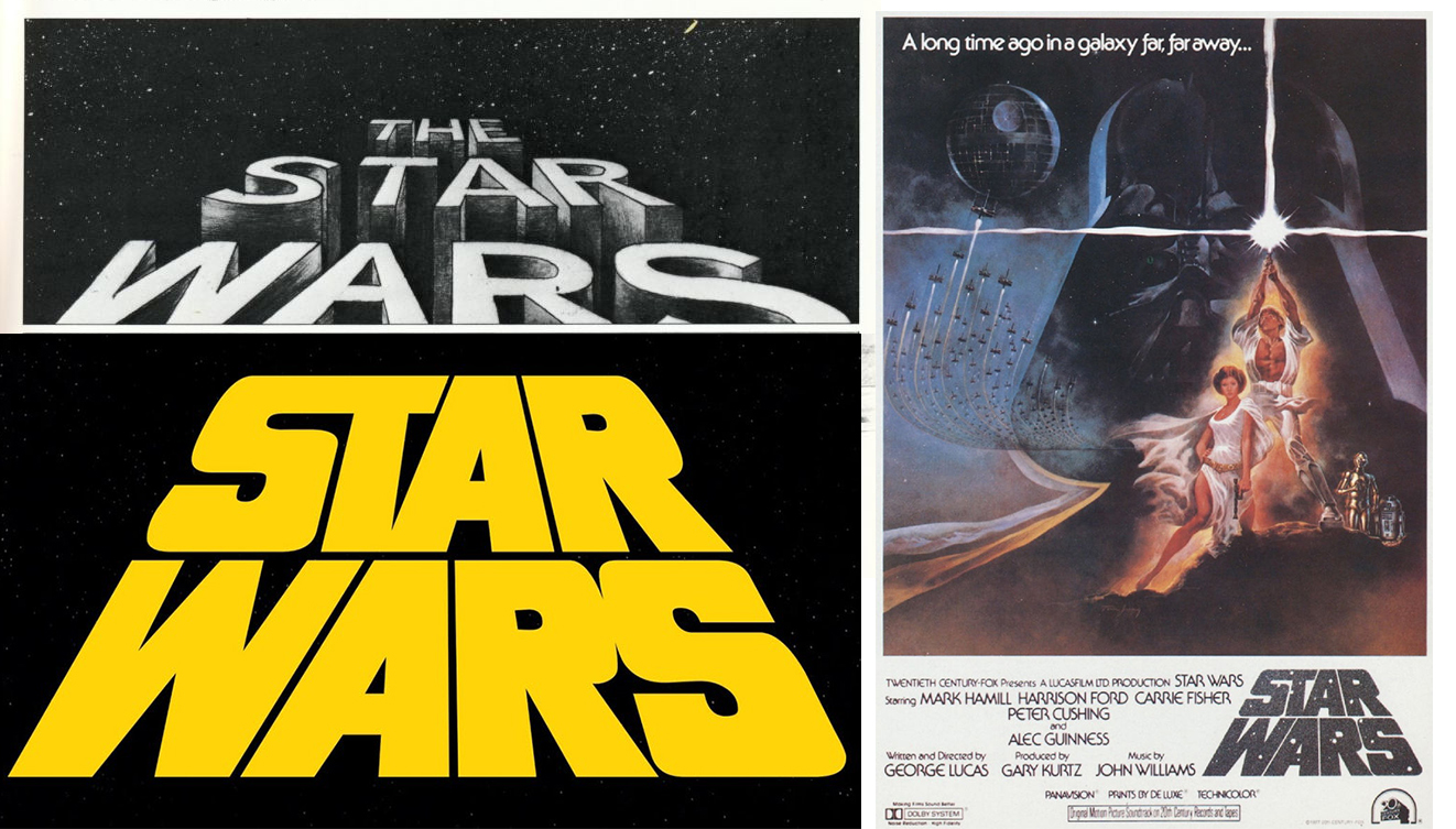 Kao što je ranije pomenuto, originalni naslov je bio The Star Wars, na storibordu Aleksa Tavoularisa može se videti prvi dizajn za uvodni tekst. Inspiracija za ovo, prema Lukasu, bili su uvodni tekstovi korišćeni u filmovima Flash Gordon, Buck Rogers i The Green Hornet serijalu. Vođen time, tipograf Den Peri je dizajnirao logo za uvodni tekst. On na kraju nije korišćen za uvodni tekst, nego se pojavio u štampi, na plakatima i reklamama.