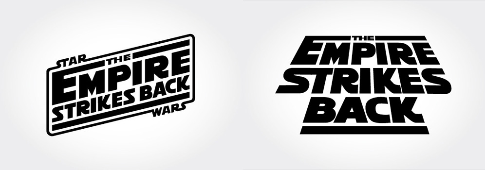 Logotip za Imperija uzvraća udarac se odlučuje za drugi kreativni pravac i ne preuzima snažan, „fašistički“ stil. Nagib slova daje osećaj brzine i avanture, dok oštri uglovi i zadebljana slova odgovaraju „sci-fi“ stilu tog vremena. Zakrivljeni kosi silazni potez slova „R“ primenjen je i na slovo „K.“ Kerning je konzistentan. Zaobljena bordura ujedinjuje celinu i povezuje je sa logom franšize. Sam naslov filma je stavljen u prvi plan u odnosu na naziv franšize. Reč „Imperija“ zauzima najviše prostora i samim tim daje vizuelni dojam o samoj radnji filma.