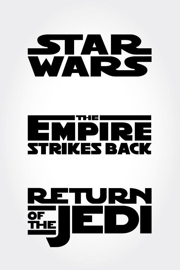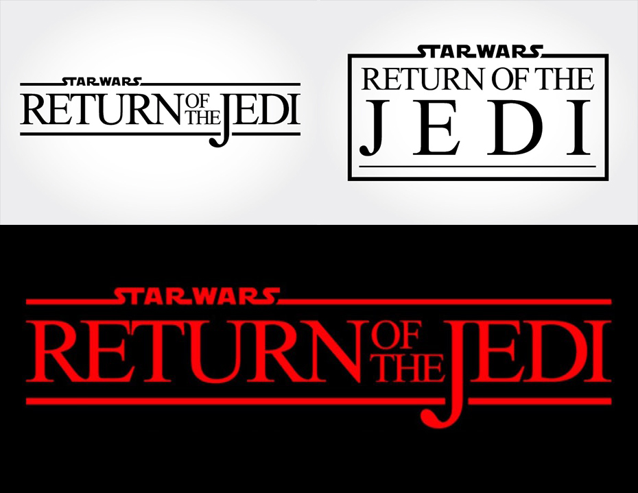 Kao i Imperija uzvraća udarac, i Povratak džedaja prolazi kroz mnoge promene u svom razvoju. Prvobitno, naslov filma je bila Osveta džedaja, ali Lukas je zaključio da osveta nije u džedajskom duhu te je naslov promenjen u Povratak džedaja. Ovaj logotip (koji budi osećaj rada u Microsoft Word-u) kultnu, modifikovanu Helveticu odbacuje u korist najpoznatijeg fonta, Times New Roman-a. Serifna slova su previše zbijena, a jedina zanimljiva modifikacija je slovo „J“ koje pada ispod linije podvlačenjam, koja služi kao alternativni tretman za prethodno uokvireni logotip. Tekst „Star Wars“ se nije uklopio u borduru tako da produžetak poslednjeg slova “S” neusidreno teče u prazan prostor. Jedna od većih promena je boja logotipa – od žute, preko bele do crvene – što izaziva zlokobni osećaj. Ovo je poprilično ironično, jer se Imperija uzvraća udarac najčešće smatra tamnim poglavljem ove trilogije, dok se Povratak džedaja završava borbom Evoka.