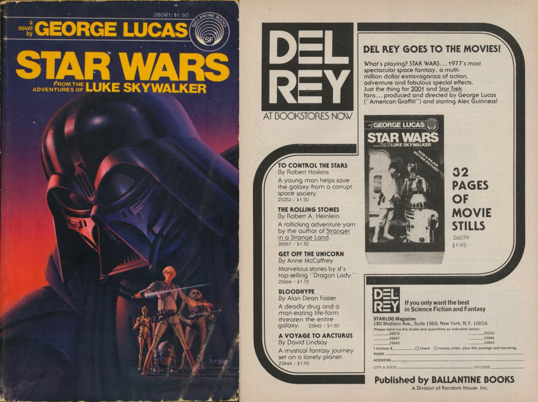 U decembru 1976, Ballantine Books objavio je novelizaciju Lukasovog scenarija Epizode IV, napisanu od strane Alana Dina Fostera. Ilustraciju za naslovnu stranicu kreirao je Mekvori, dok korišćeni font je iz porodice Helvetica. Oglas na celoj stranici za knjige Del Rey pojavio se u Starlog #7, avgusta 1977. Uključena je i Star Wars novela sa fotografijom na naslovnoj strani. Knjiga sa ovom naslovnicom nikada nije objavljena. Umesto fotografije bila je prethodno pomenuta ilustracija sa logom.