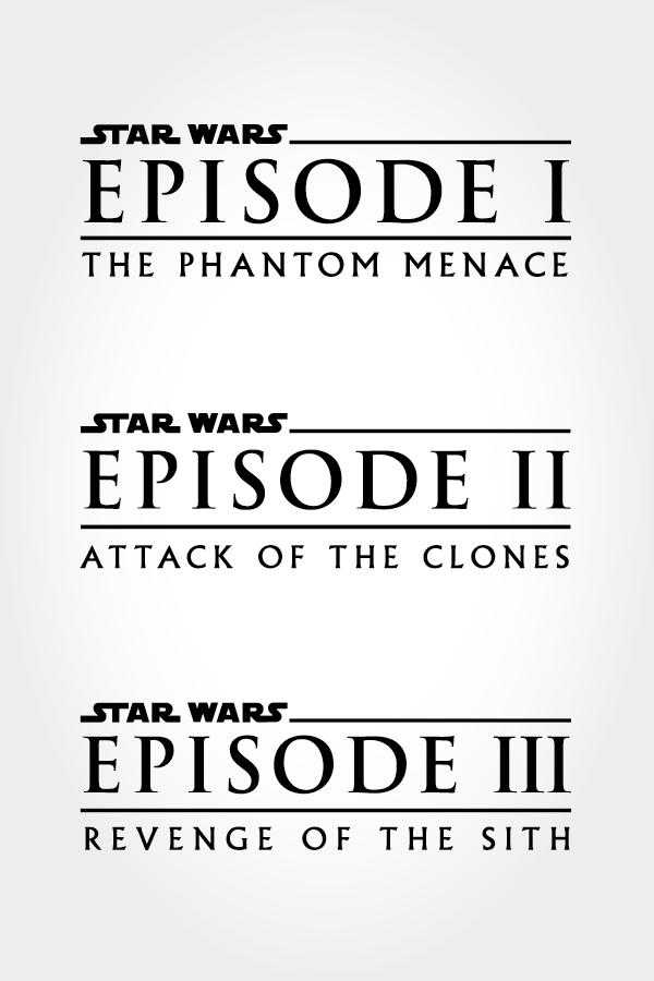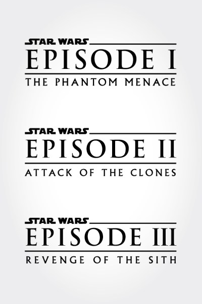 Logotipi prikvel trilogije su imali jedan veliki zadatak: da naglase da su ti filmovi prednastavci. Kako bi “obrazovali” publiku, ovi logotipi stavljaju svoj naglasak na numeraciju epizode. Ogromni tekst postavljen u Trajan-u (aka „filmskom fontu“): „EPISODE I“ ispunjava najveći deo logotipa, dok je „Star Wars“ je postavljen u gornjem levom uglu. Stvarni naslov, koji koristi font Albertus, je poslednji deo hijerarhije i pozicioniran je ispod. Posledica toga je da ćemo danas češće čuti „Epizoda I“ nego „The Phantom Menace“ .